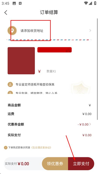 3、在订单结算页面,添加收货地址后点击立即支付按钮,完成买酒流程。