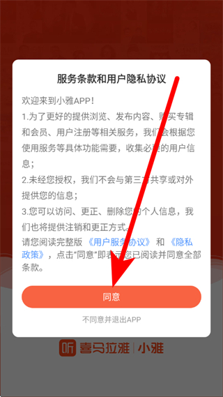1、打开小雅,在服务条款和用户隐私协议弹窗中,点击同意。
