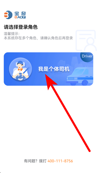 1、打开宝奇司机端,在登录角色选择页面,点击我是个体司机,进入司机端界面。