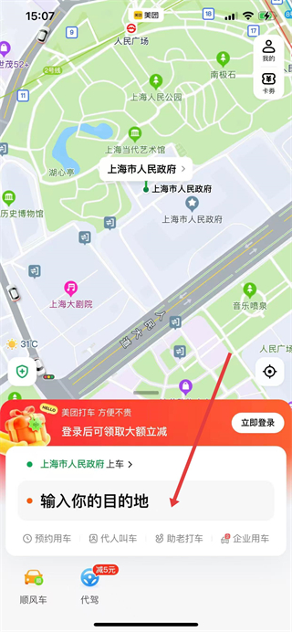 1、打开美团打车应用,进入主界面后,在输入你的目的地输入框中,输入你的最终目的地。