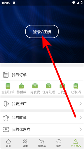 2、在个人中心页面,点击登录注册,进入登录界面。