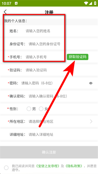 4、在注册页面,输入手机号等信息,点击获取验证码。