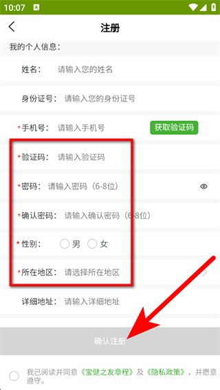 5、在输入框,输入验证码,设置密码,勾选相关协议后,点击确认注册,完成注册。