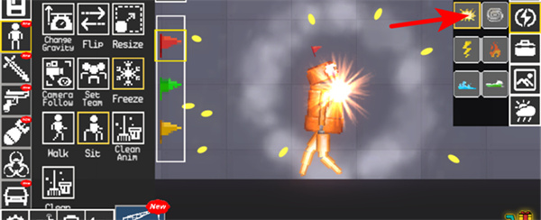 1、点击红色箭头指向的爆炸按钮,可对场景中的角色触发爆炸效果,测试互动反应。