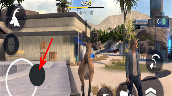 2、进入游戏后,通过红色箭头指向的左侧虚拟摇杆,可操控山羊向任意方向移动,探索场景。
