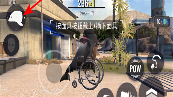 4、按照提示点击红色箭头指向的面具按钮,可给角色戴上面具,解锁新的外观与互动效果。