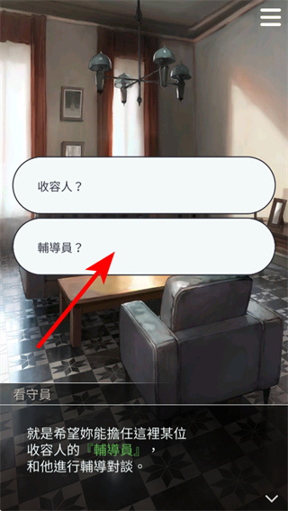 4、继续选择红色箭头指向的对话选项如辅导员,回应角色的信息,深入了解剧情设定。
