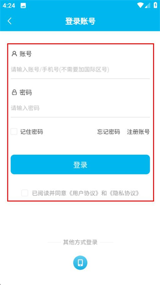 3、在登录账号页面,填写信息,勾选协议后点击登录完成登录。
