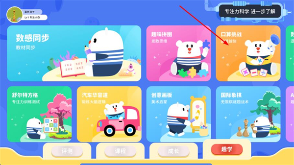2、在趣学页面,找到口算挑战板块,点击进入对应内容页面。