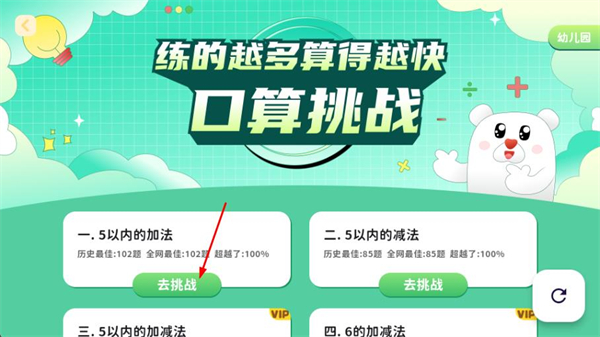 3、在口算挑战页面,选择一.5以内的加法,点击去挑战进入练习。