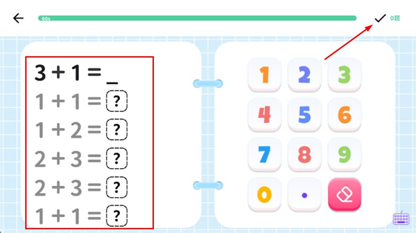 4、在口算练习页面,完成题目后点击右上角对勾提交答案。