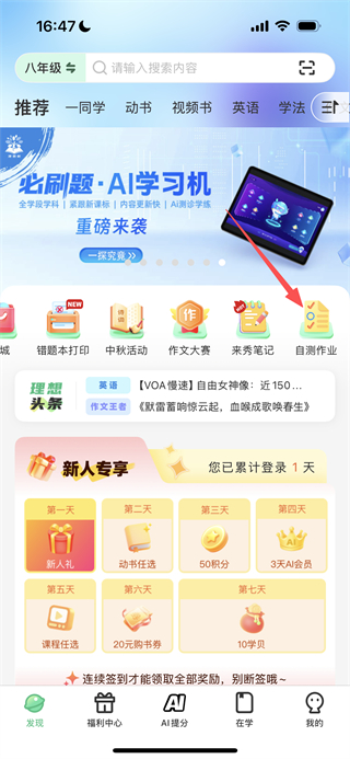 1、在理想树发现页面,点击自测作业选项,进入自测作业页面。