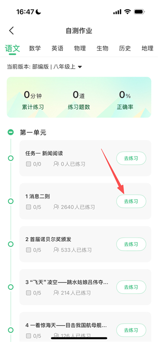2、在自测作业页面,选择1消息二则对应的去练习按钮,进入题目页面。