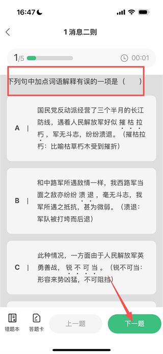3、在1消息二则题目页面,完成题目后点击下一题继续作答题目。
