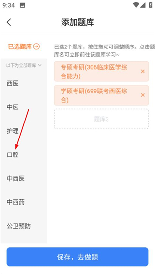 3、在口腔题库列表中选择口腔执业医师后,点击保存按钮完成添加。