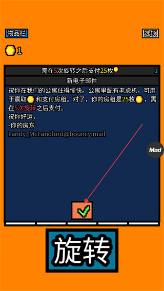 1、查看新电子邮件了解房租需在5次旋转后支付25枚金币,点击界面中的绿色对勾按钮确认邮件。