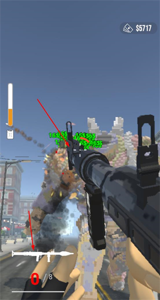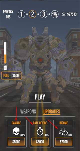 2、点击开启战斗,使用武器射击方块巨兽,积累伤害数值推进进程。