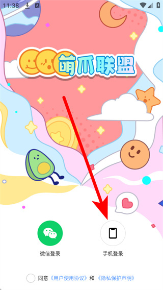 1、打开萌爪联盟,进入后弹出弹窗,点击同意,进入登录方式选择页面。