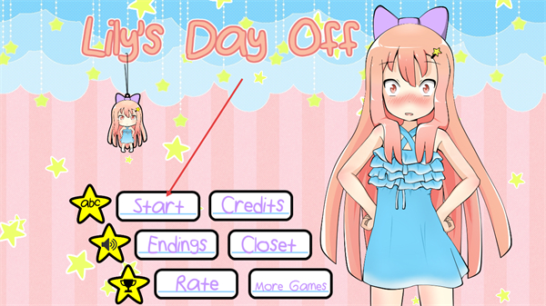 1、在莉莉的假期的主界面中,点击Start按钮可开启游戏,也能通过Credits查看制作信息、Closet等按钮进行对应操作。