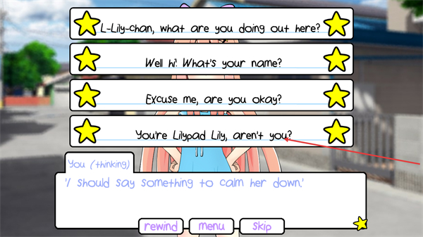 3、在对话选项界面中,需选择对应的对话选项如You'reLilypadLily,aren'tyou,以此推进与Lily的互动并影响剧情走向。