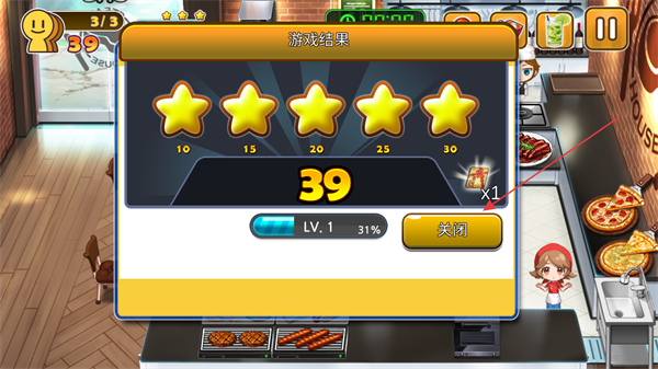 4、关卡结束显示游戏结果,获得39分及五星评价,点击关闭结算关卡。