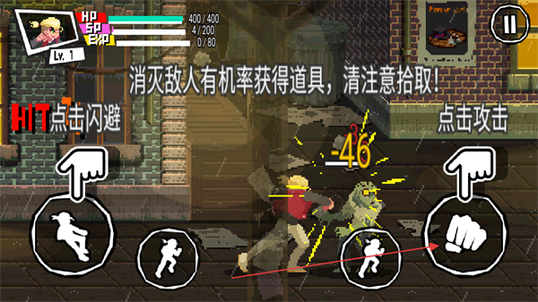 1、战斗时点击点击攻击按钮攻击僵尸,同时用点击闪避躲避敌人攻击,消灭敌人可概率获得道具。