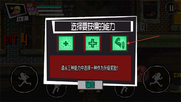 2、升级后会弹出能力选择界面,从回复生命、提升攻击等能力中选一种比如选攻击类,点击确定获得加成。
