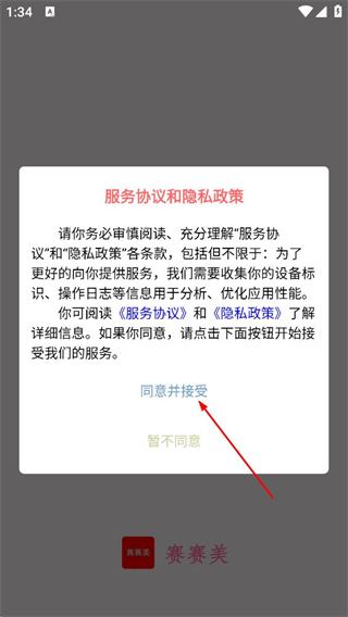 1、在服务协议和隐私政策弹窗中,点击同意并接受,进入赛赛美的首页。