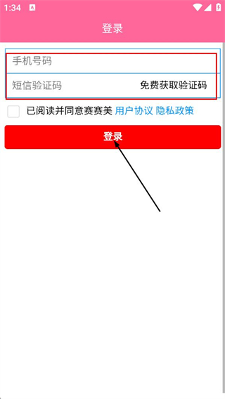3、在登录页面,填写手机号码和验证码,点击登录,完成赛赛美账号的登录操作。