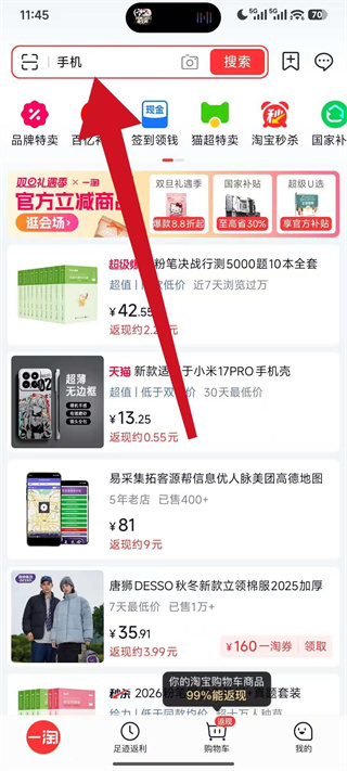 1、打开一淘,进入首页后点击顶部搜索框,进入搜索界面。