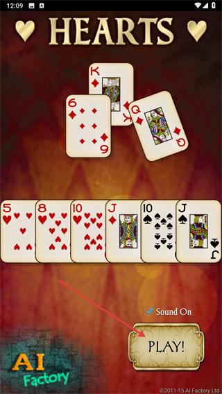 1、这是红心大战纸牌游戏的初始界面,界面显示游戏名称及牌面元素,底部有PLAY按钮,点击该按钮即可进入游戏的后续选择环节。