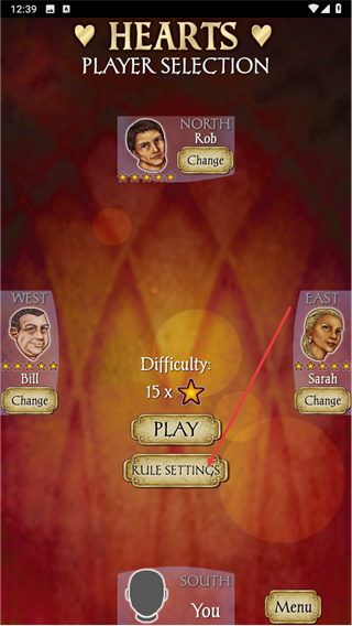 2、此为红心大战的PLAYERSELECTION界面,可选择对手并调整Difficulty,点击RULESETTINGS选项可以调整规则。