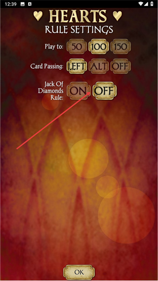 3、进入红心大战的RULESETTINGS界面,可设置Playto分数、CardPassing方式及JackOfDiamondsRule,设置后点击OK即可应用规则进入游戏。