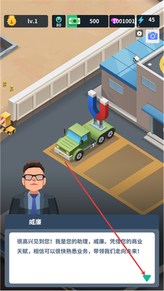 2、进入游戏后出现助理威廉的介绍对话,点击对话框下方的箭头按钮跳过该对话,即可继续推进游戏的后续环节。