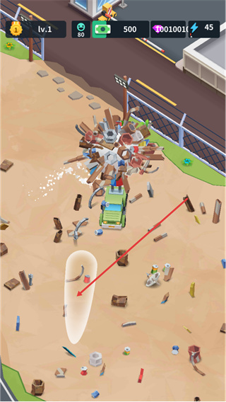 3、进入废料收集环节,操控车辆移动到废料区域,收集场景内的各类废料,完成车辆的废料装载任务以推进流程。