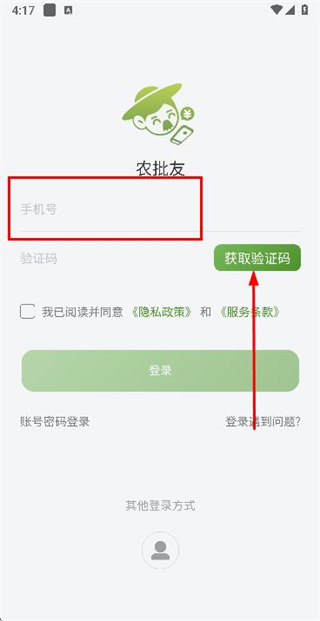 2、在登录页面填写手机号,勾选协议后,点击获取验证码。