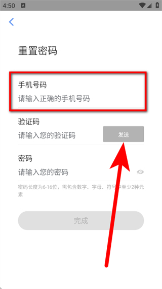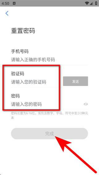 5、在输入框输入验证码,设置新密码,点击完成,完成密码重置。
