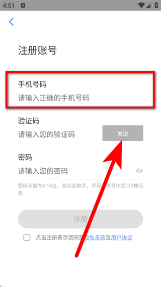 3、在注册账号页面,输入手机号码,点击获取验证码。