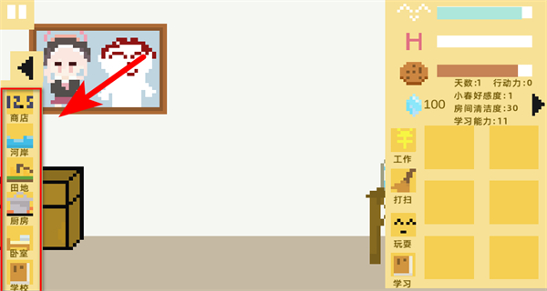 小春养成记内置菜单最新版是一款复古像素风格的自由养成类游戏,内置菜单为养成提供便利,核心围绕五十天内的角色培养展开,玩家需合理分配每日两点行动力,兼顾工作创收、打扫清洁、陪伴玩耍与辅导学习,应对三次关键考试,同时可探索商业街、服装店等多场景,通过道具购买、钓鱼种地等方式优化养成策略,解锁丰富互动内容。