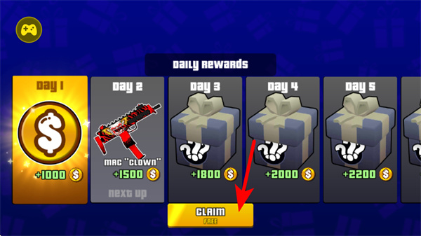 2、进入每日奖励界面后,点击红色箭头指向的CLAIM按钮,领取当日的奖励资源,为后续游戏积累道具。