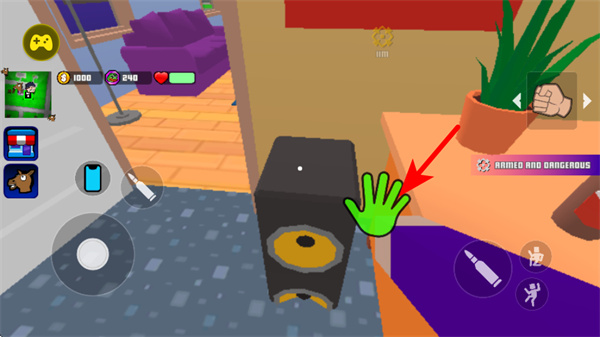 3、进入室内场景后,点击红色箭头指向的weapons按钮,获取场景内的武器道具,提升角色的战斗能力做准备。