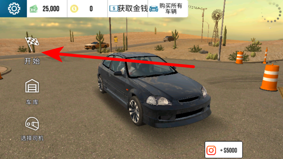 2、在环境选择页面选沙漠场景,点击下方开始按钮进入驾驶场景。