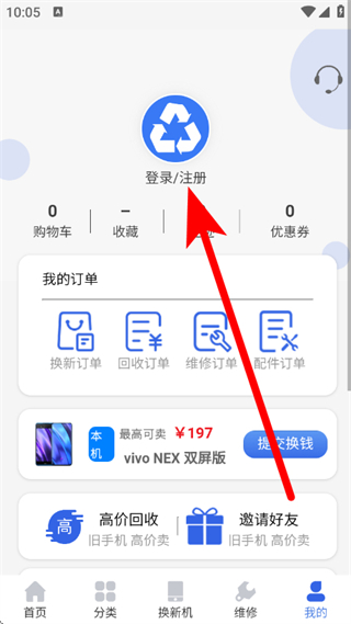 2、在我的页面,点击上方的登录注册,进入登录界面。