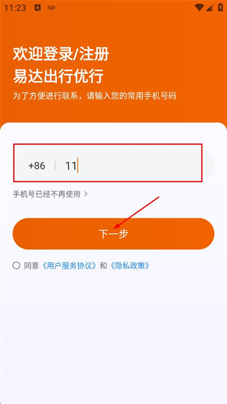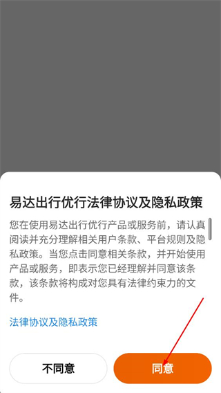 1、阅读易达出行优行法律协议及隐私政策后,点击同意。