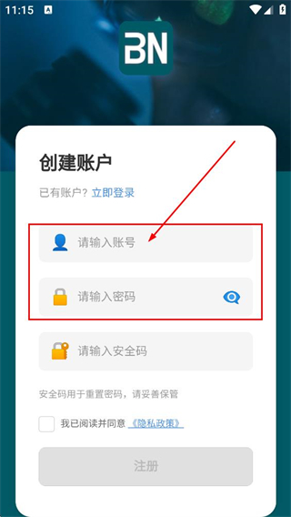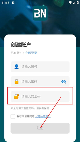 3、在创建账户页,填写安全码,点击注册,完成账号登录。