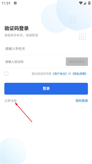 2、在验证码登录页,点击立即注册的选项,进入注册账号页面。
