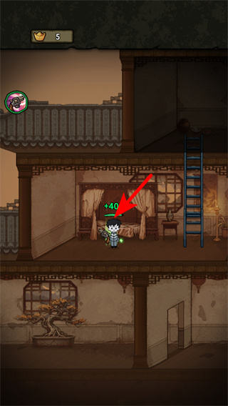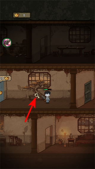 1、进入古宅场景后,操控角色移动到红色箭头指向的物品旁,点击交互获取初始资源,这是积累游戏道具关键操作。