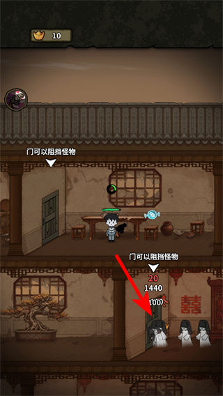 3、遇到怪物时,移动到红色箭头指向的门旁,消耗资源关闭门阻挡怪物,参与者保障角色安全并继续探索场景。