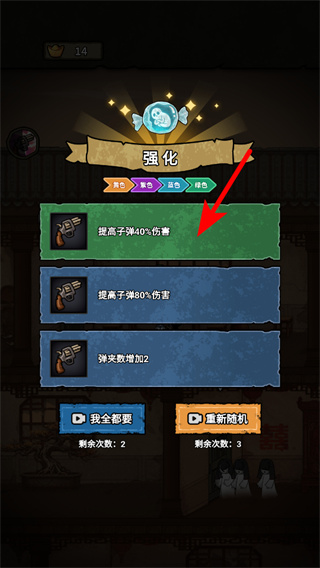 4、获得强化机会后,在强化界面点击红色箭头指向的提高子弹40%伤害选项,强化角色攻击能力,提升战斗效率。