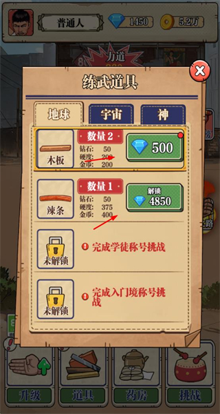 2、在练武道具界面,消耗钻石购买木板等道具,积累道具提升练武效率,为对战做准备。